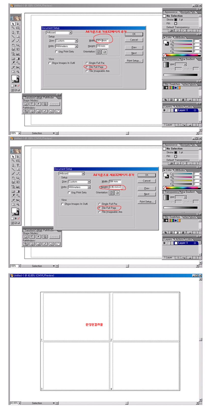 cs2,cs3에서는 document setup에서 가로(210mm*2),세로(297mm*2) 사이즈 정하시고 prints하시면 나오는창의 왼쪽윗부분에 setup누르시고 tiling정하시면됩니다... 그리고 프린트하면 A4에 1페이지~4페이지 각각한장씩 프린트됩니다